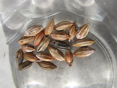 Il y a une semaine environ, j'ai récolté une vingtaine de fruits d'éléagnus pour les manger. Mais j'ai trop attendu et je les ai retrouvés plein de moisi. Du coup, je les ai nettoyés et en ai récupéré les noyaux.